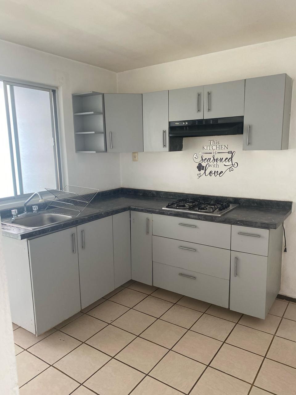 Cocina integral equipada con estufa, campana y múltiples gabinetes para almacenamiento.